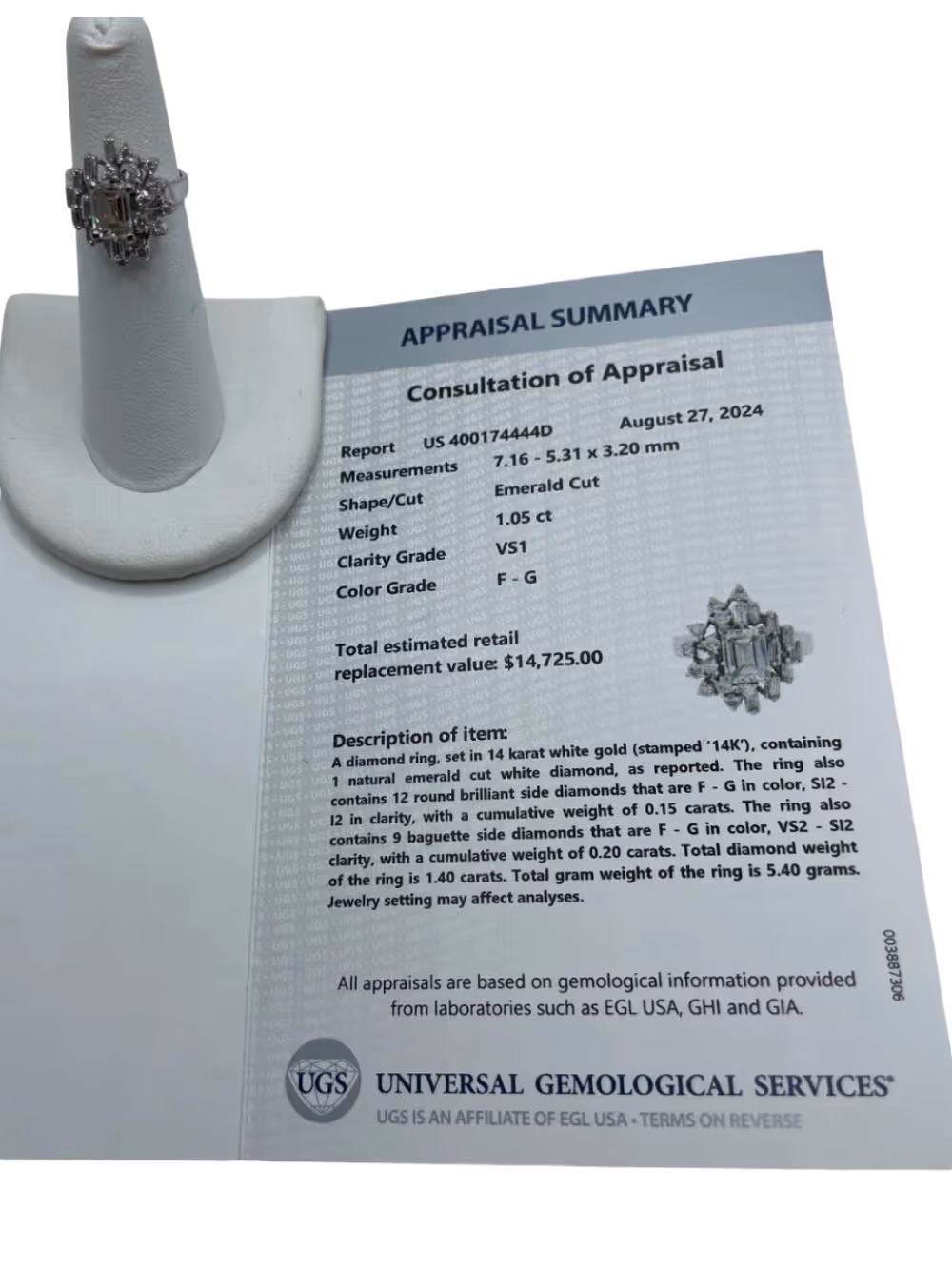 This stunning ring boasts 23 natural diamonds with a total carat weight of 1.40 Ct. The main stone is a 1.05 ct emerald cut diamond with a very slightly included (VS1) clarity grade and a G color grade. The ring is a US size 5 and has been carefully inspected for authenticity and quality. Offered in excellent pre-owned condition, it shows only minor signs of wear consistent with gentle use, making it ready to wear or a standout addition to a fine jewelry collection. The ring comes with an EGL certificate verifying its quality, and a UGS appraisal summary is included, offering additional documentation and valuation for your peace of mind.