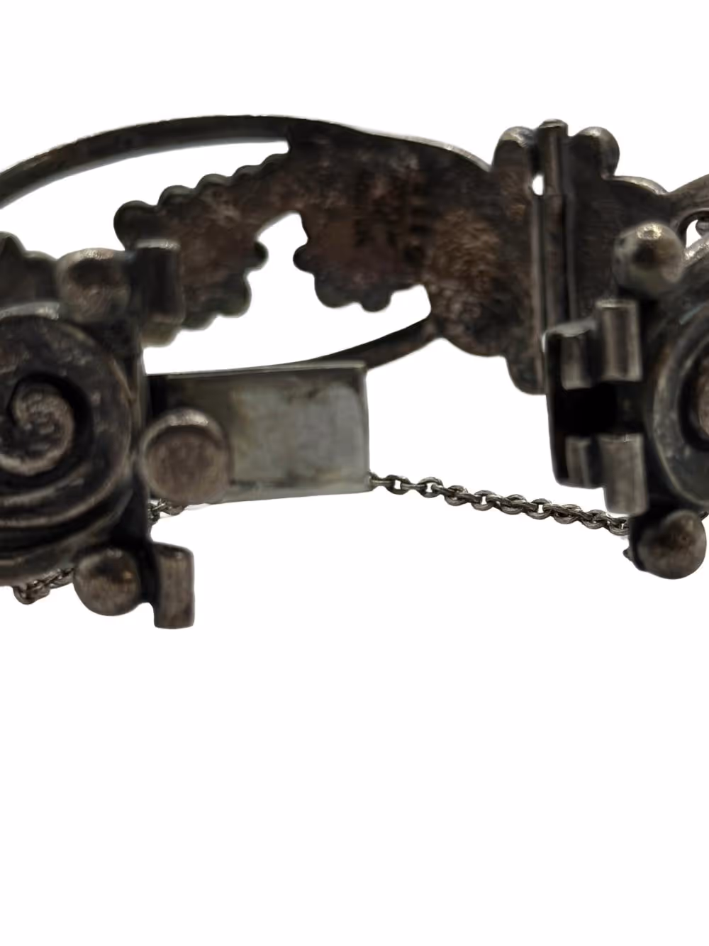 Offered here is an authentic vintage Margot de Taxco Clamper Bracelet, design number 5337, crafted in sterling silver. This elegant hinged cuff reflects Margot’s signature artistry and sculptural style, making it a coveted piece among collectors of mid-century Mexican silver jewelry. Scroll below for additional details and dimensions!