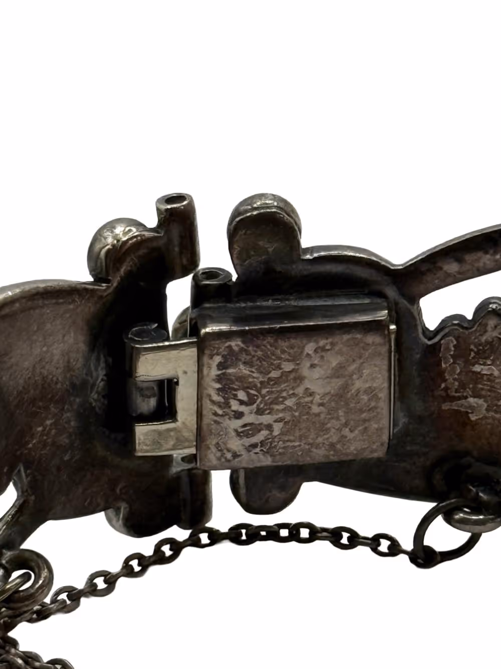 - Condition: Vintage preowned condition – features a dark natural patina with subtle purple and blue hues, enhancing its vintage appeal. Can be polished to restore a bright silver finish if desired.