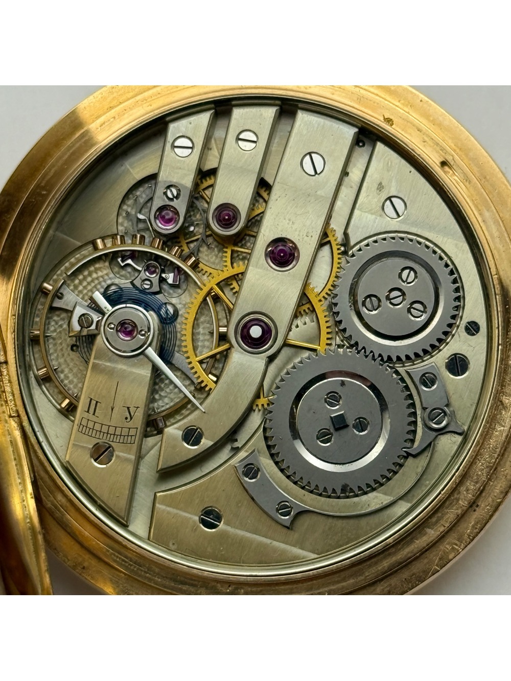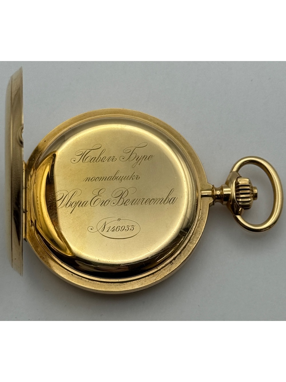 Offered here is a very rare and historically significant Paul Buhre pocket watch, dating from 1907-1908, featuring inscriptions in Cyrillic: “Pavel Bure” (П.Буре) and “Supplier of His Majesty's Court” (Поставщик Двора Его Величества) on the movement cover. This is a high-end solid 18K yellow gold version, heavier and more prestigious than the more common 14K models produced in the same era. Scroll below for additional details!